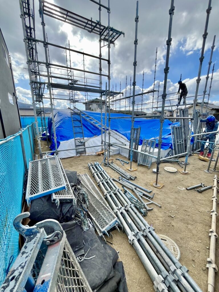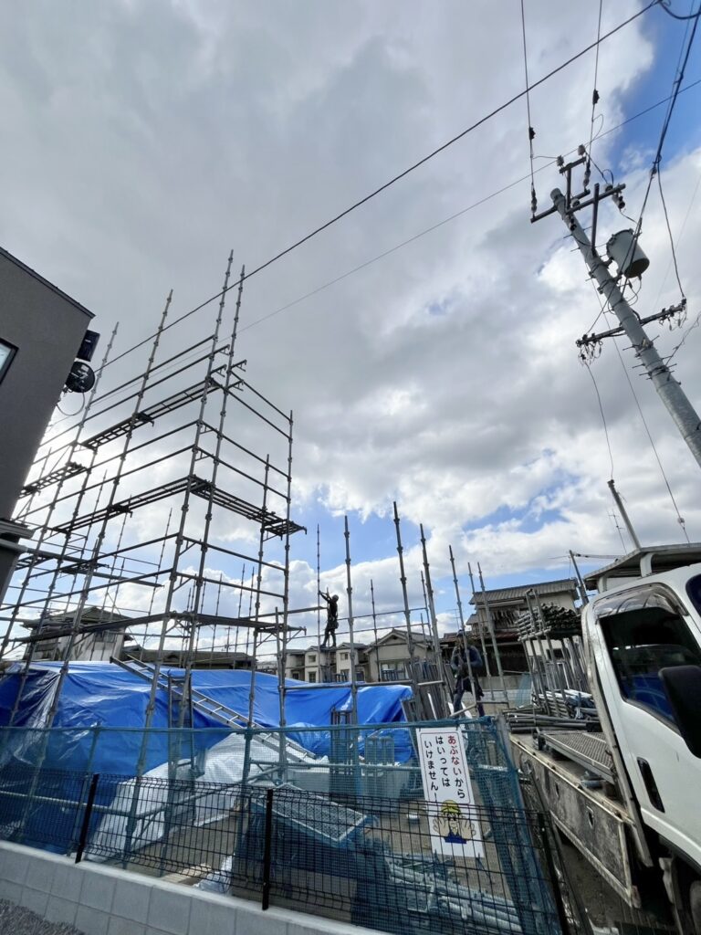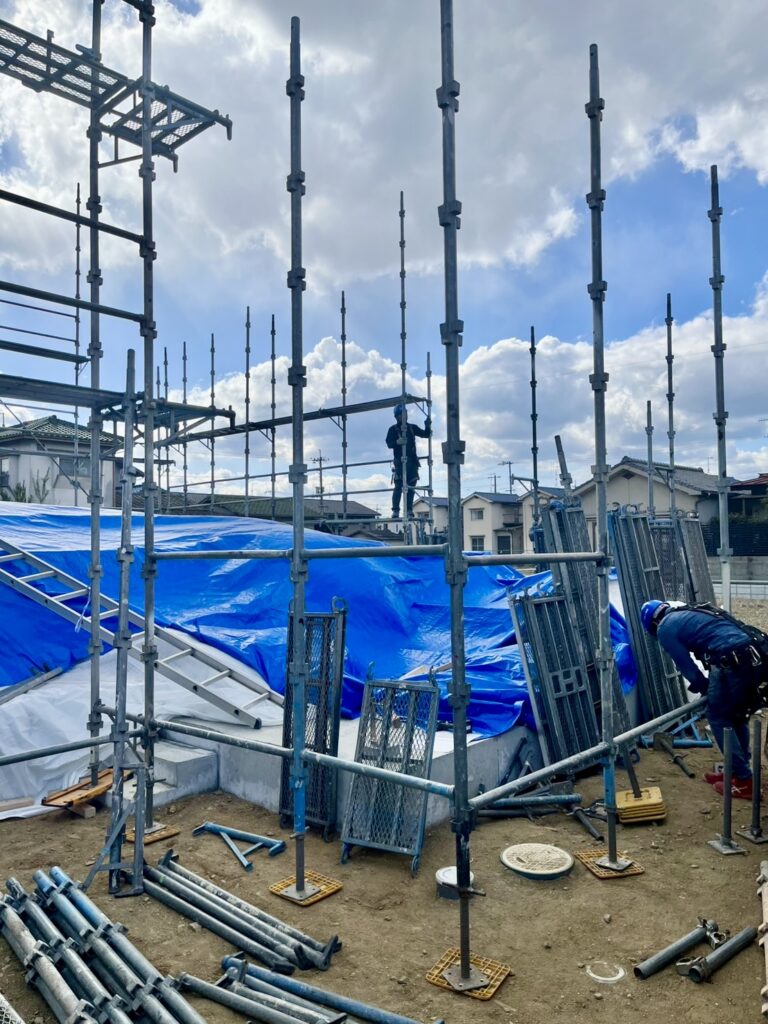 現場では、明日の上棟に向けて足場が組まれていました✩.˚